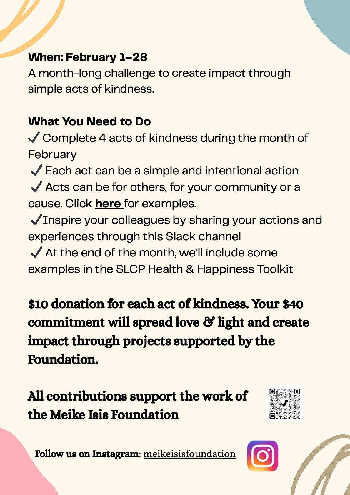 Geïnspireerd door en ter ondersteuning van de Meike Isis Foundation organiseerde de wereldwijde non-profitorganisatie SLCP in februari 2026 een ‘Acts of Kindness challenge’. De 40 teamleden registreerden een maand lang al hun 'Acts of Kindness' (daden van vriendelijkheid) en de organisatie financierde 10 USD voor elke goede daad. Dit leidde tot een ‘do good & feel good’-initiatief waaraan wereldwijde team deelnam (China, India, Nederland en de VS en nog vele andere landen).